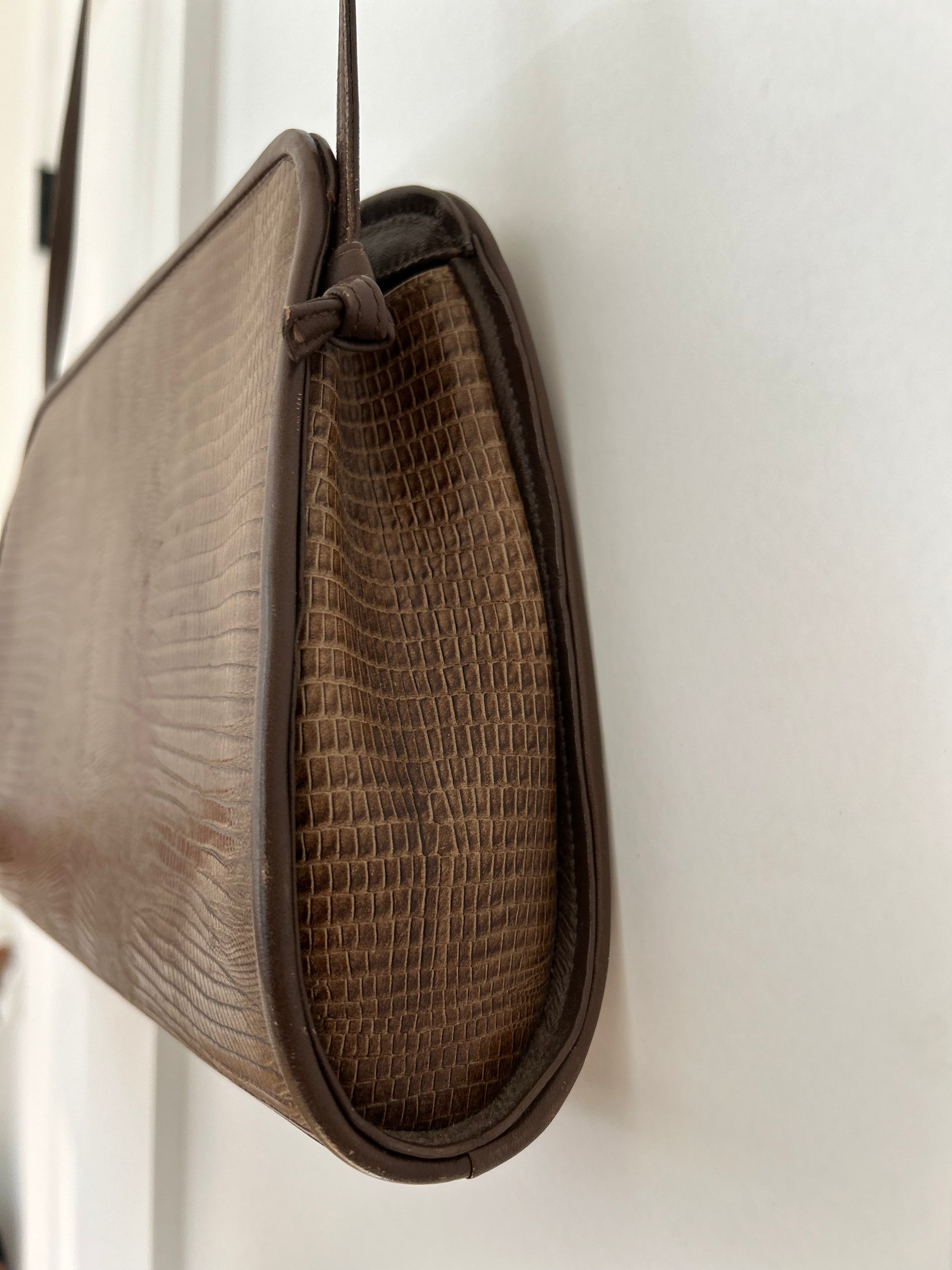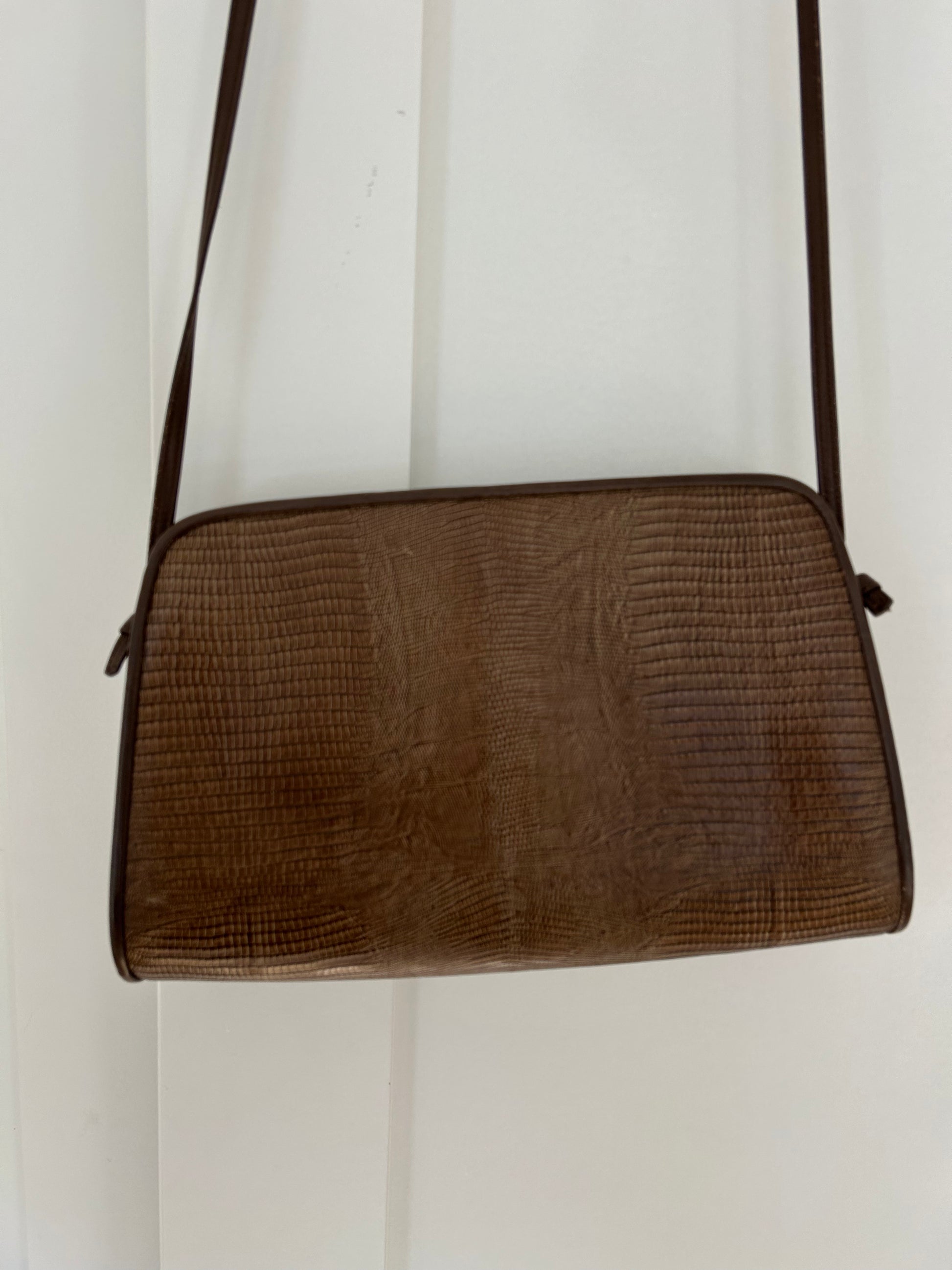 Lizard like embossed texture. Strap is detachable. Taupe colored genuine leather with contrasting medium brown trim. Zip closure